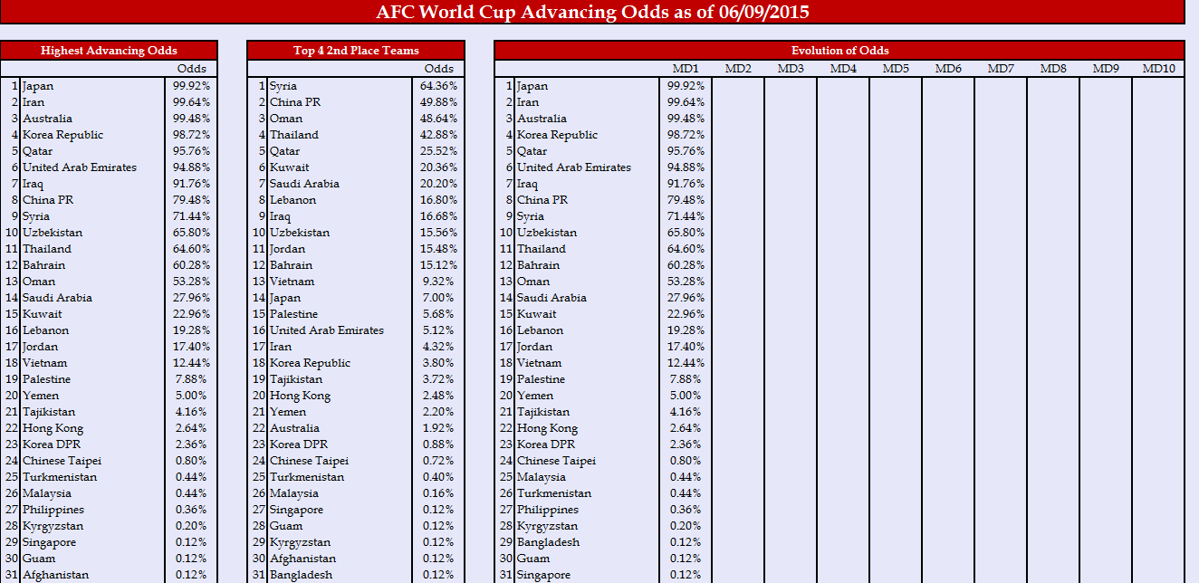 This group is Japan’s to lose. It would be arguably the biggest shock of qualifying to see Japan not advance. We rank them #1, with a 99.92% chance of advancing. They did not finish worse than 2nd in a single simulation of 2,500. But after Japan, this group is wide open. Our rankings give a pretty strong edge to Syria, but that’s probably overstated. Afghanistan and Singapore are certainly capable of giving them a run for their money. Cambodia isn’t half bad either. Japan is just that good. This group is going to produce a lot of excitement and a lot of hope for the teams in this group.