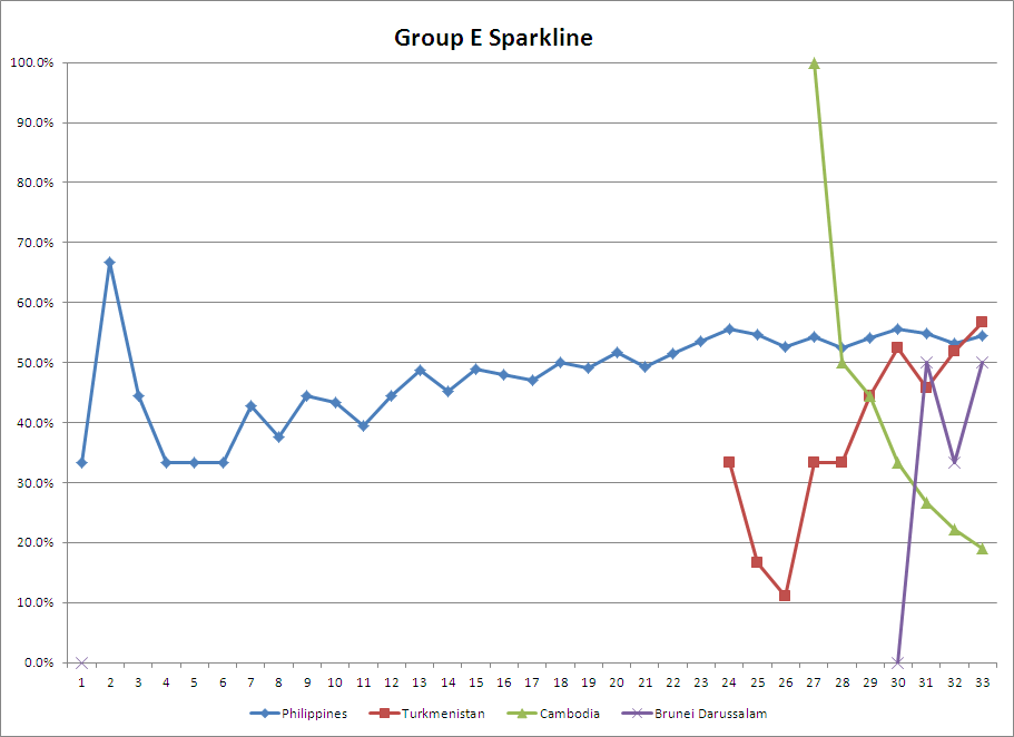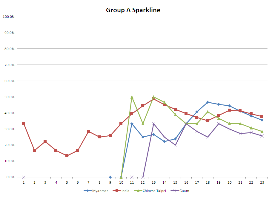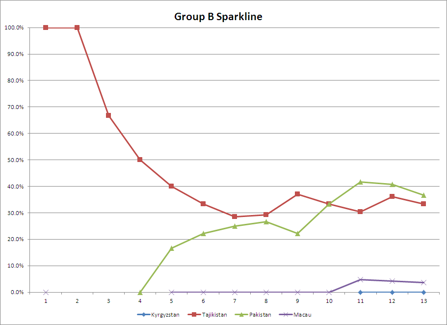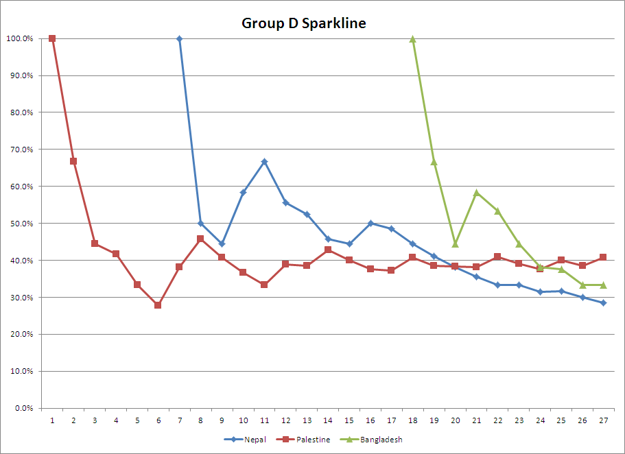 Similar to our projections, the Sparklines show that no team in this group has performed too well. Palestine has been hovering around the 40% mark for quite some time while Nepal has just been in a freefall. Hosting a Non-FIFA squad is probably what you want to get yourself out of that mess. Nepal will be looking to win, but most likely will be content with a draw against an intimidating Palestine squad. Bangladesh may be able to make a little noise, but more than likely this will come down to Nepal and Palestine.